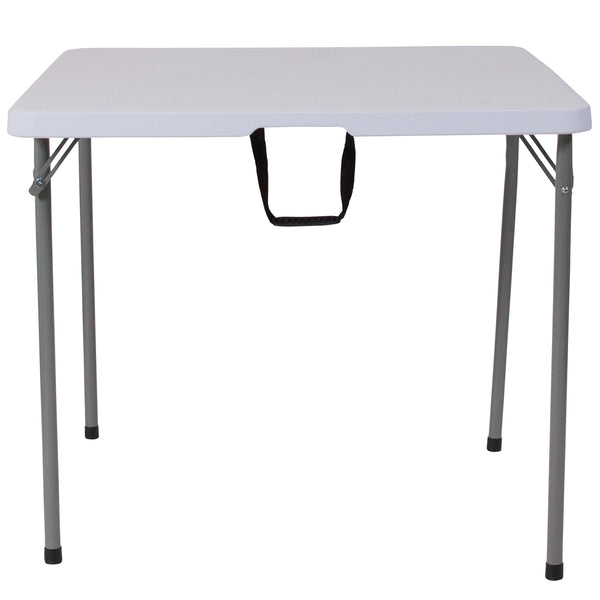 This square folding table is beneficial in a multitude of settings that include banquet halls, conference centers, cafeterias, schools and in the home. The table can be used as a temporary seating solution or be setup for everyday use. The bi-fold feature folds the table in half the size and includes a carrying handle for easy transport. The durable blow molded top is low maintenance and cleans easily. The table legs fold under the table to make storage more convenient and for better portability. This table is commercial grade to withstand everyday use in the hospitality industry.